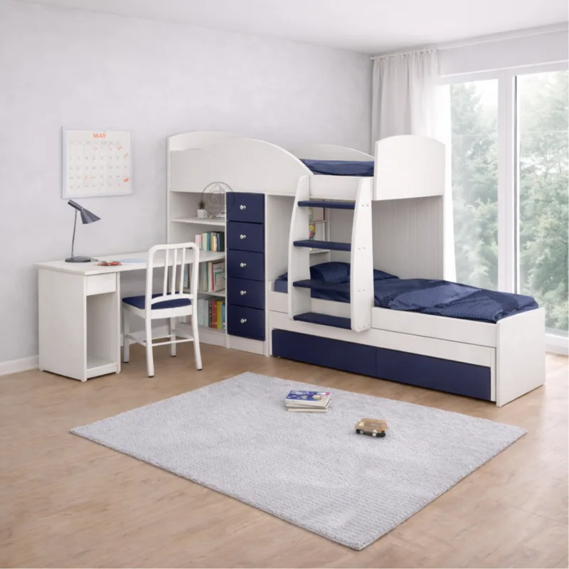 מערכת שינה מושלמת לילדים, הכוללת מיטת קומותיים מרווחת לילדים, שולחן כתיבה וכוננית מובנית. עשויה MDF בלגי איכותי ויצוק, בהתאם לתו התקן הישראלי, עמיד בפני שריטות ומתאימה לשימוש יומיומי לאורך זמן. מאפשרת שילוב צבעים מותאם אישית מתוך מניפת הפורמיקה של בירמן.