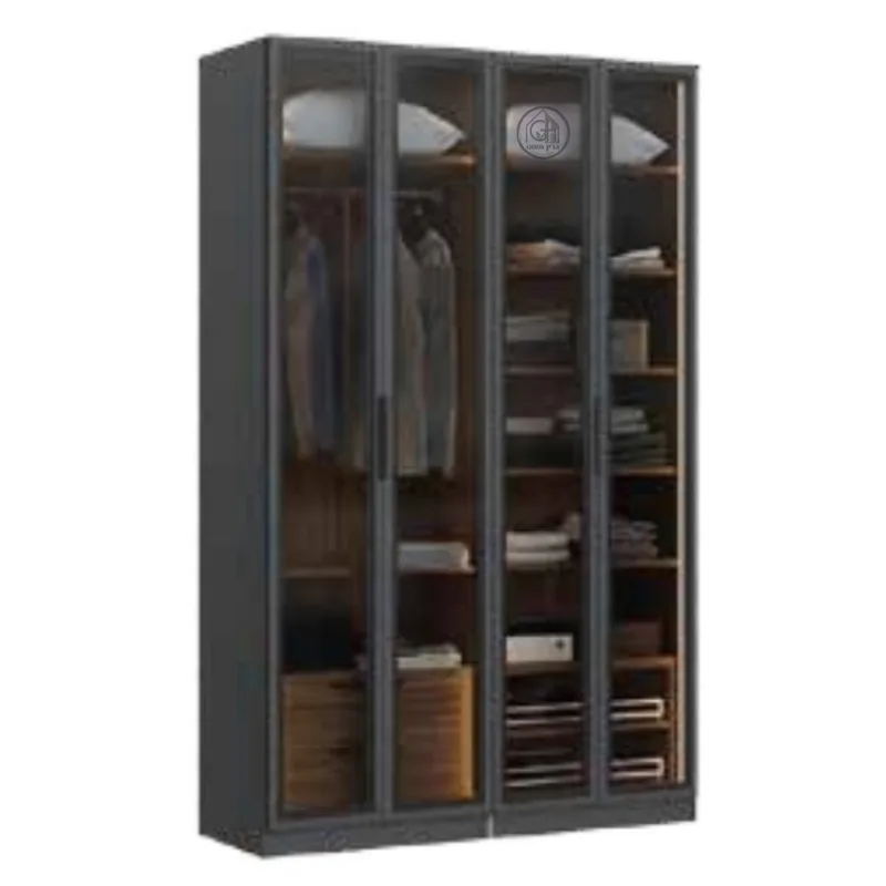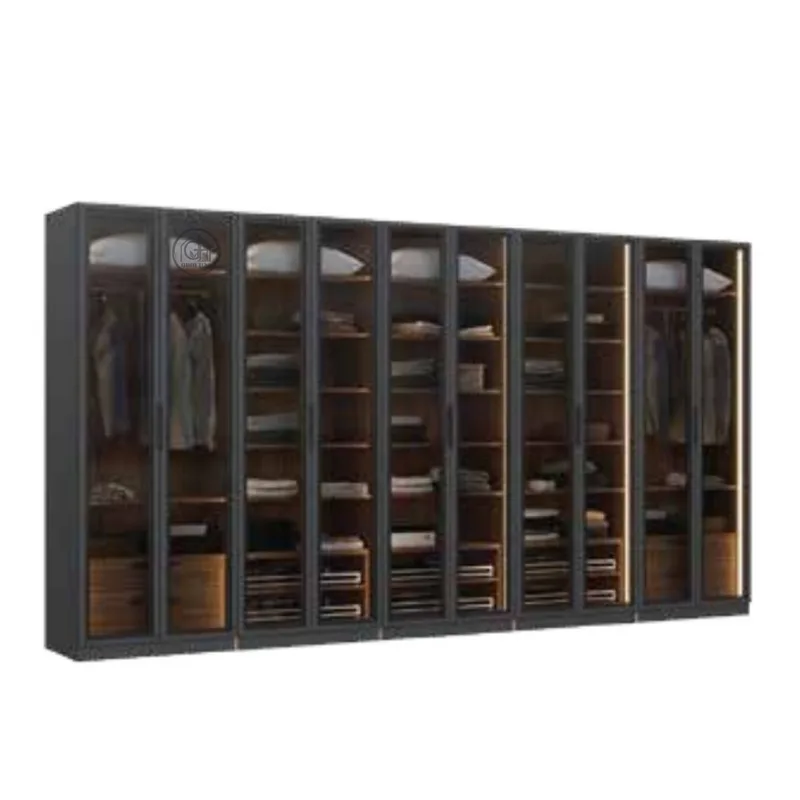 ארון בגדים איכותי בגימור מוקפד, כולל מסגרת אלומיניום שחורה ודלתות זכוכית לבחירה. הארון תוכנן לנראות מודרנית ולשימוש יומיומי נוח, עם מערכת טריקה שקטה מתקדמת ומגירות אחסון פנימיות.