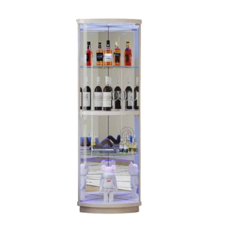 ויטרינה פינתית מעוצבת הכוללת תאורה פנימית, המיועדת להצגה אלגנטית של פריטי נוי, כלי זכוכית או בקבוקי יין. העיצוב הקלאסי-מודרני משתלב באופן מושלם בפינת הסלון, ומעניק לחלל תחושת יוקרה ונוכחות. התאורה הפנימית מחולקת ל 2 קומות עם מחיצת עץ בין הקומות המדגישה את תכולת הויטרינה ומוסיפה עומק ואווירה לחלל.
