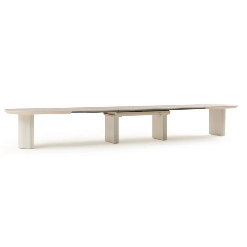 שולחן אוכל מרשים עם מנגנון פתיחה מתקדם, משטח בגימור פורמייקה איכותי ורגליים מעוצבות עם חריצים אנכיים. מתאים לחללי אירוח גדולים ומעניק פתרון פונקציונלי מרשים לאירוח רב משתתפים.