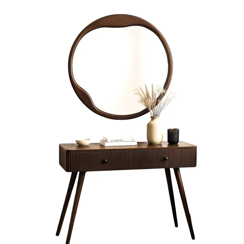 מראה עגולה בעיצוב אמורפי, עם מסגרת עץ מלא בגימור טבעי – בגוון כהה או בהיר לבחירה.