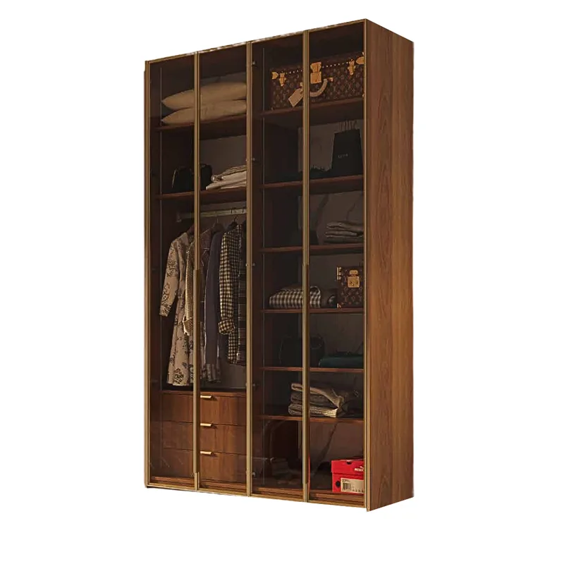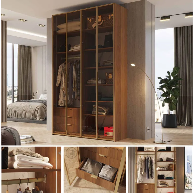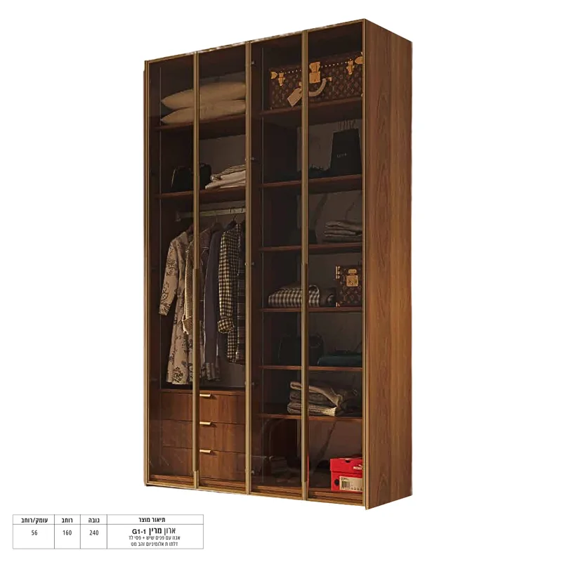 ארון בגדים איכותי עם דלתות זכוכית מחוסמת במסגרת אלומיניום ומבנה פנימי מחולק לנוחות מרבית.