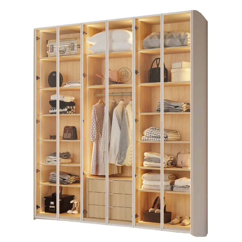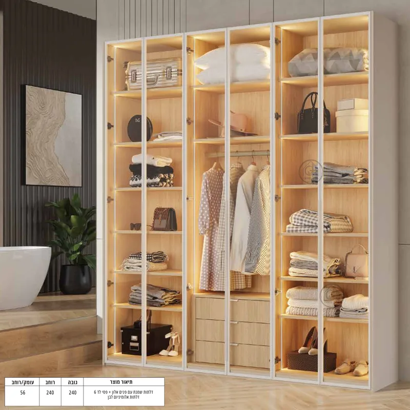 ארון בגדים בעיצוב מודרני ומרשים, עם חזית זכוכית מלאה ותאורה פנימית מעוצבת.