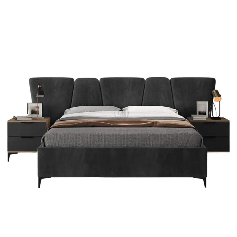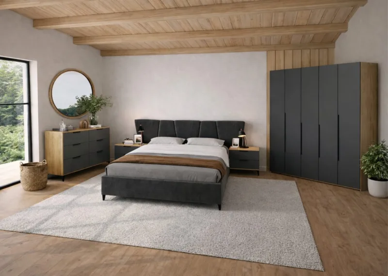 סט חדר שינה מודרני ומוקפד, המשלב קווים נקיים, חומרים איכותיים ואחסון חכם ליצירת חלל שינה יוקרתי, נעים ופונקציונלי.