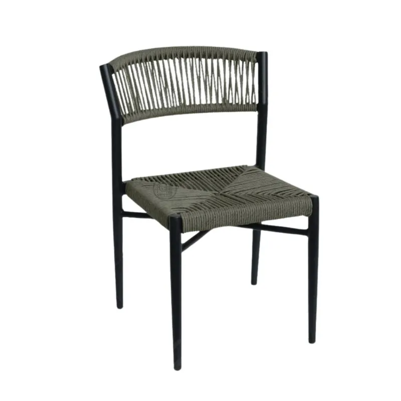 כיסא מעוצב בקווים מודרניים, משלב גוף מתכת חזק עם ריפוד חבל ייחודי ליצירת מראה טבעי, קליל ועמיד. מתאים לשימוש בבית, בגינה, בבתי קפה ובחללים מעוצבים.