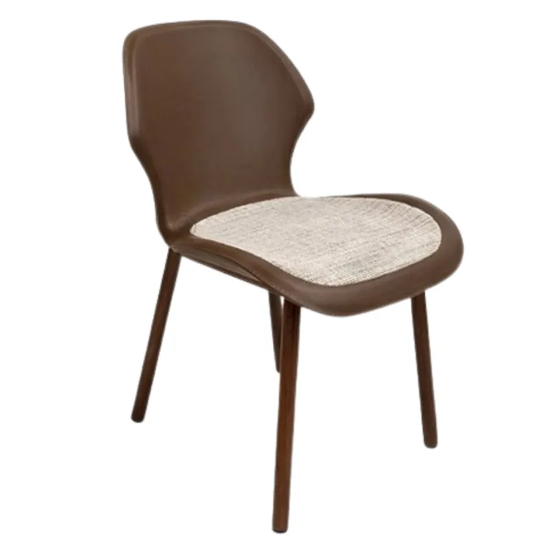 כיסא אוכל בעיצוב מודרני בקווים מעוגלים, המשלב מעטפת דמוי עור עם מושב טקסטיל מרופד ושלדת מתכת יציבה.