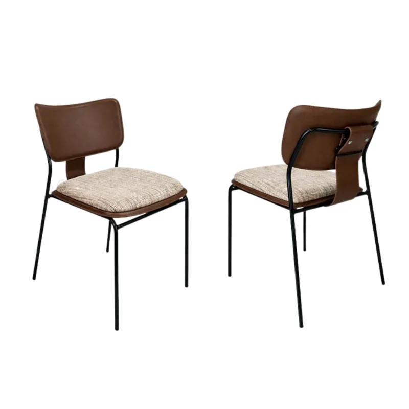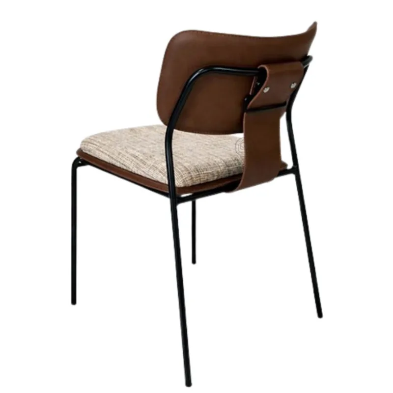 כיסא אוכל בעיצוב מודרני עם נגיעה תעשייתית, המשלב גב דמוי עור בגוון שוקולד עם מושב טקסטיל מרופד. שלדת מתכת שחורה מעניקה יציבות ומראה מרשים.