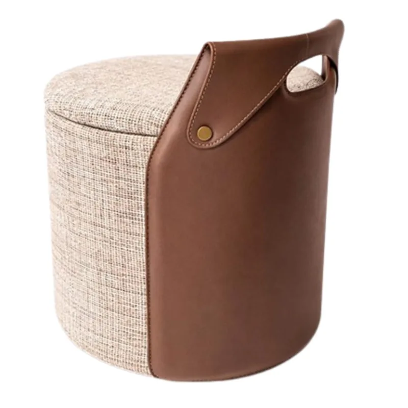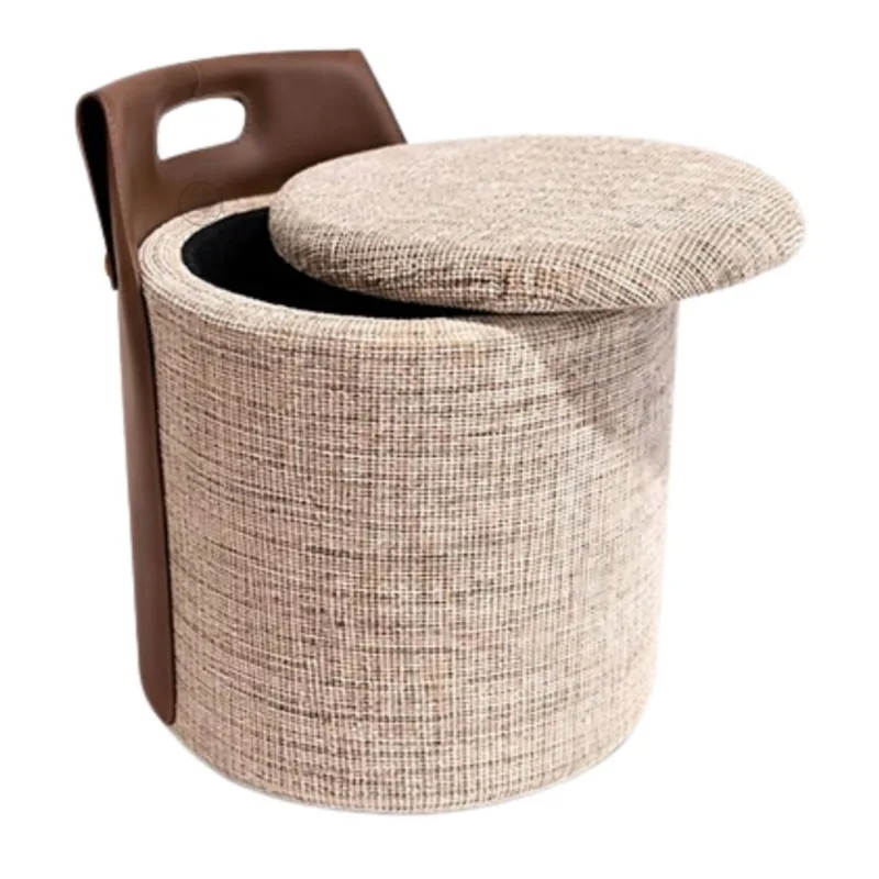 הדום עגול בעיצוב אלגנטי ופונקציונלי, המשלב טקסטיל איכותי בגוון טבעי עם דמוי עור בצבע שוקולד. כולל מכסה נפתח ותא אחסון פנימי – פתרון מושלם לסלון, חדר שינה או פינת ישיבה.