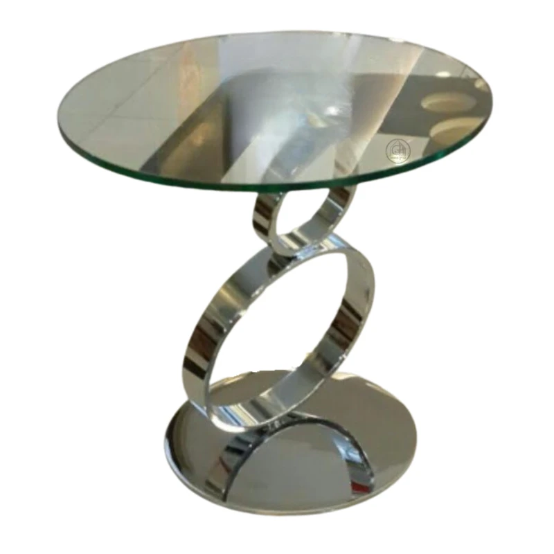 שולחן קטן בעיצוב מודרני, עשוי שילוב של ניקל מבריק וזכוכית מחוסמת בעובי 12 מ"מ. מתאים לשימוש כמעמד צד, שולחן סלון קטן או פריט דקורטיבי בחלל האירוח.