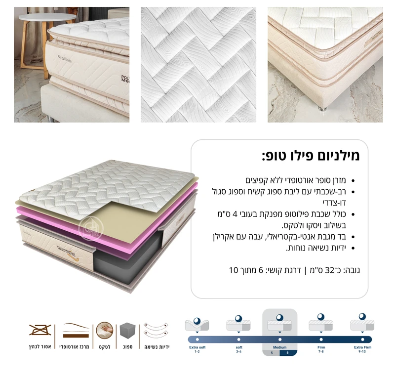 שכבת פילוטופ עליונה (4 ס"מ) – ויסקו או לטקס לבחירה, להפחתת לחצים