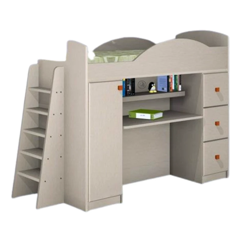מיטת גלריה איכותית הכוללת שולחן כתיבה מובנה, ארון מדפים ומערכת מגירות מרווחת.