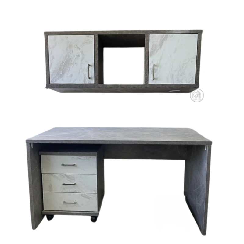 שולחן כתיבה בעיצוב מודרני ונקי, הכולל משטח עבודה מרווח ויחידת מגירות ניידת על גלגלים – לנוחות מרבית ולגמישות בשימוש. מעל השולחן, ארונית תלויה עם תאים סגורים ותא פתוח, המאפשרת אחסון נגיש ומסודר.
