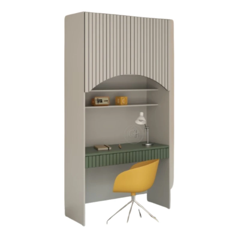 יחידת ריהוט גבוהה ומעוצבת, המשלבת שולחן עבודה עם מגירה, ארונות אחסון ומדפים פתוחים. עיצוב מודרני עם חריטות ברמת גימור גבוהה, אידיאלית לחדרי ילדים, נוער או פינת עבודה ביתית.