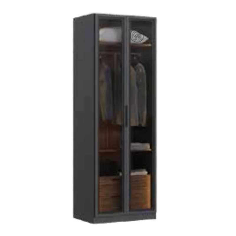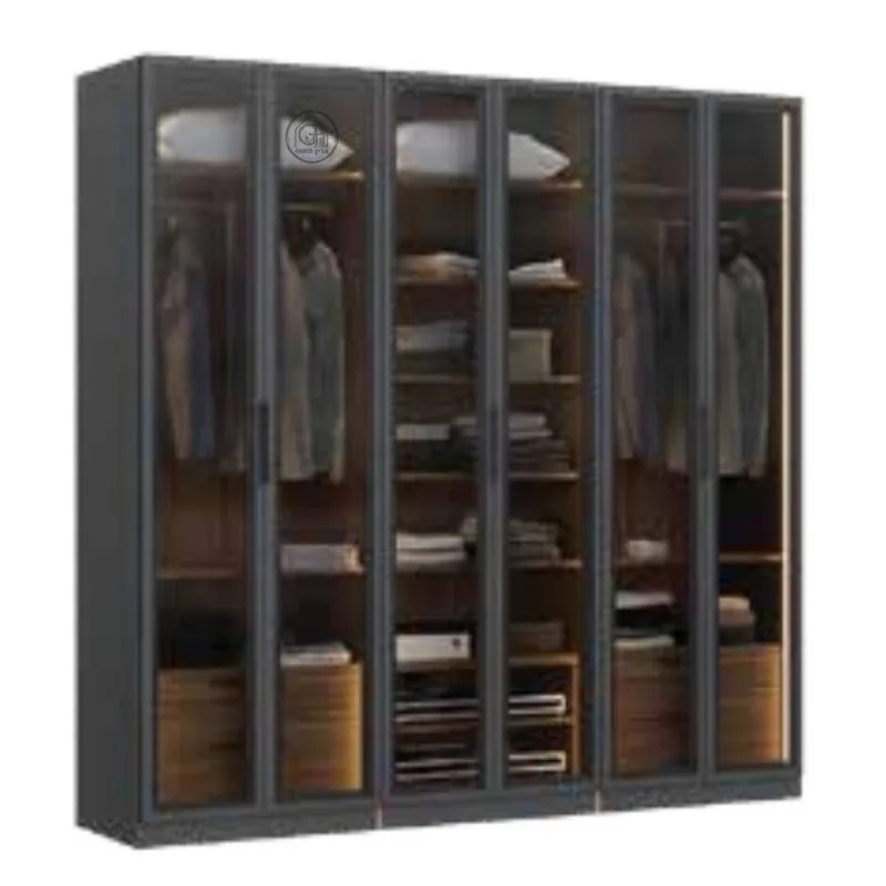 ארון בגדים איכותי בגימור מוקפד, כולל מסגרת אלומיניום שחורה ודלתות זכוכית לבחירה. הארון תוכנן לנראות מודרנית ולשימוש יומיומי נוח, עם מערכת טריקה שקטה מתקדמת ומגירות אחסון פנימיות.