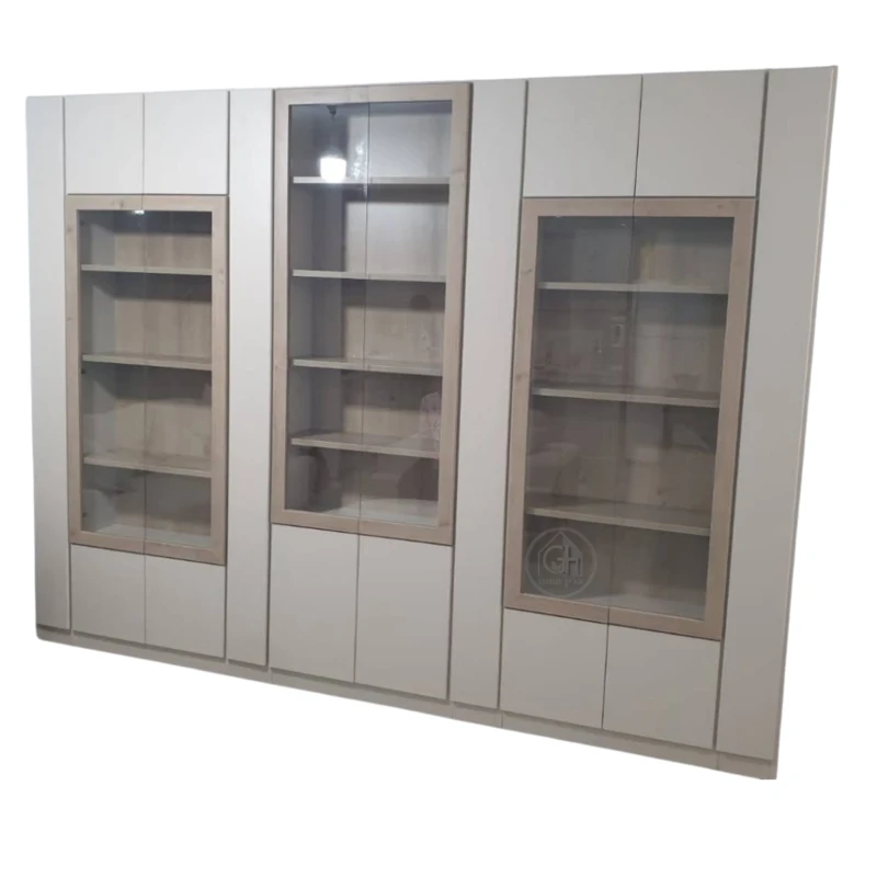ספרייה מודולרית בעיצוב מודרני ונקי, המשלבת מדפים פתוחים, ארונות סגורים ויחידות זכוכית. מתאימה לחללי מגורים, משרדים או פינות עבודה – עם נוכחות מרשימה ופתרונות אחסון מגוונים.