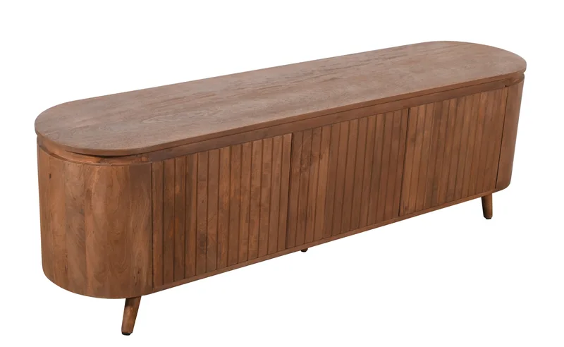 מזנון טלוויזיה רחב ומרשים, עשוי 100% עץ מנגו מלא בגוון טבעי – חומר עמיד, איכותי ובעל טקסטורה חמה שמכניסה אופי לכל חלל.