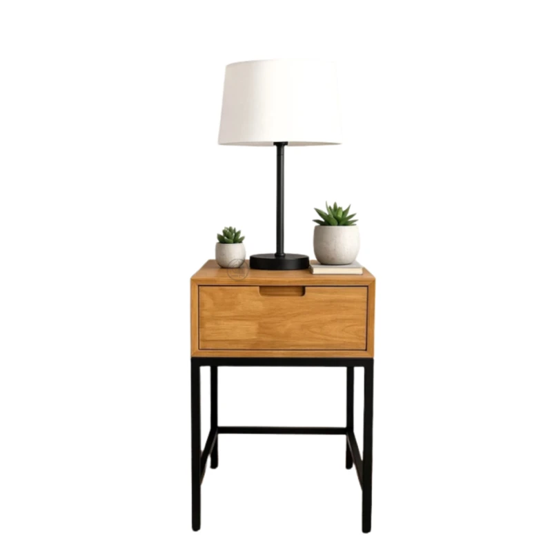 שידת צד בעיצוב מינימליסטי-תעשייתי, עשויה 100% עץ מנגו מלא בגוון טבעי, בעל טקסטורה חמה ועשירה שמכניסה רוך ואופי לכל חלל. בסיס השידה עשוי ברזל שחור מסיבי בגימור מט, המעניק לה יציבות גבוהה ונראות מודרנית.