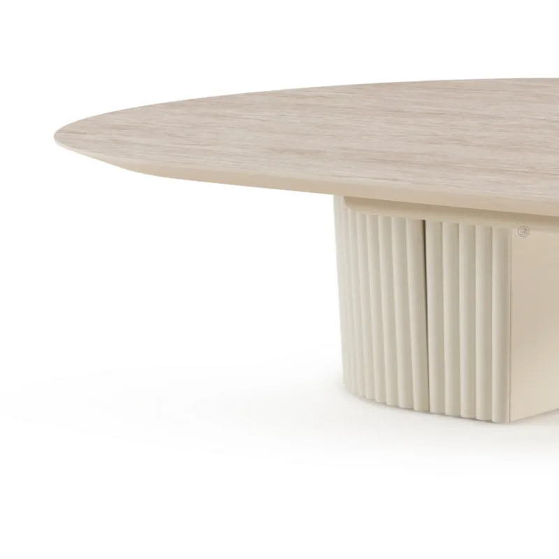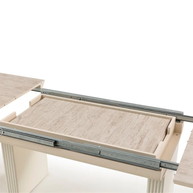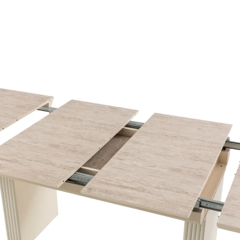 שולחן אוכל מרשים עם מנגנון פתיחה מתקדם, משטח בגימור פורמייקה איכותי ורגליים מעוצבות עם חריצים אנכיים. מתאים לחללי אירוח גדולים ומעניק פתרון פונקציונלי מרשים לאירוח רב משתתפים.
