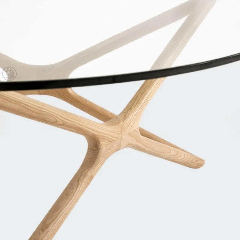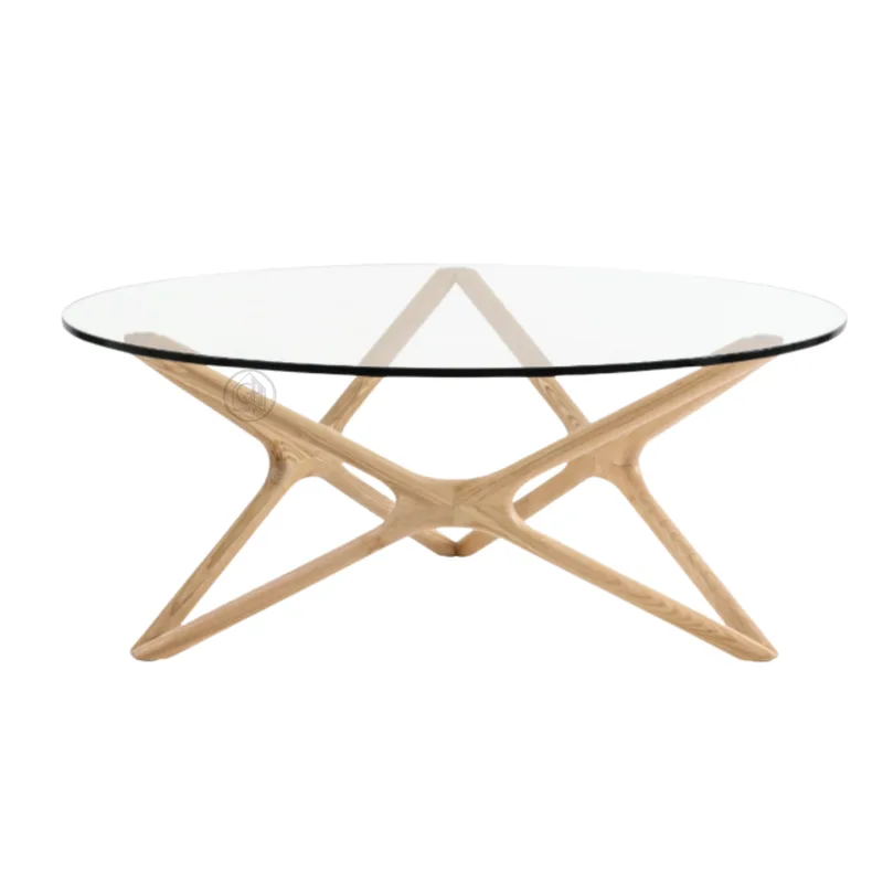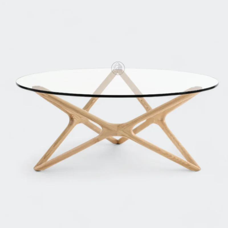 שולחן קפה בעיצוב פיסולי ואלגנטי, עשוי עץ אלון עם פלטת זכוכית עגולה.