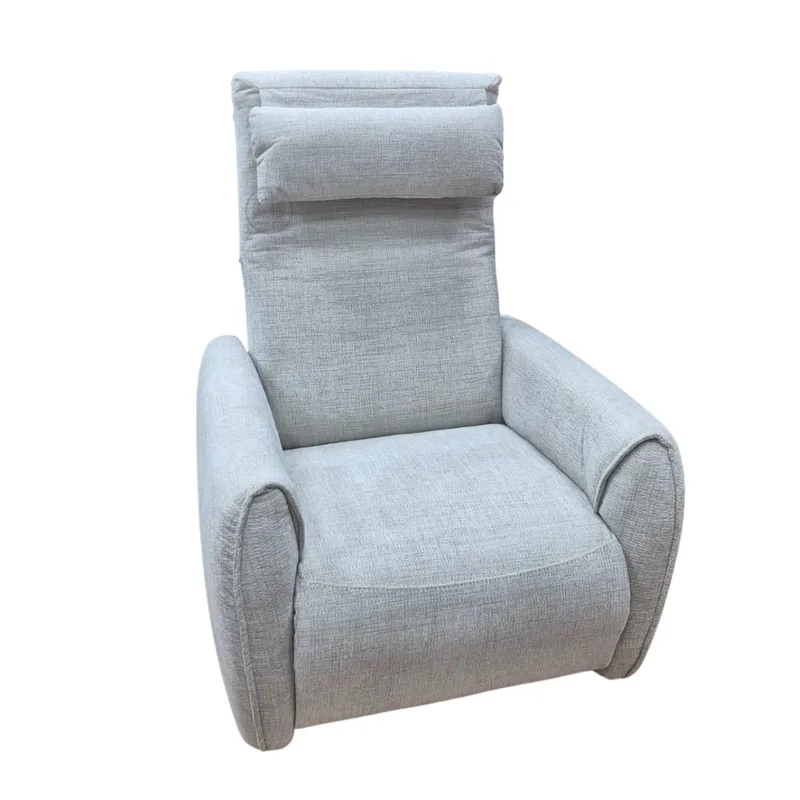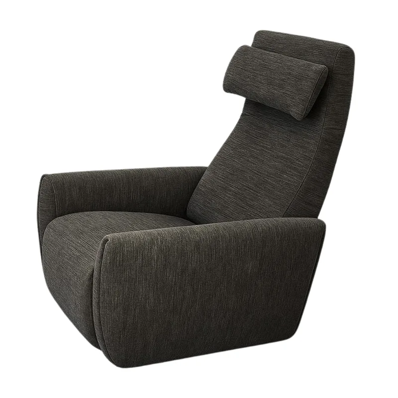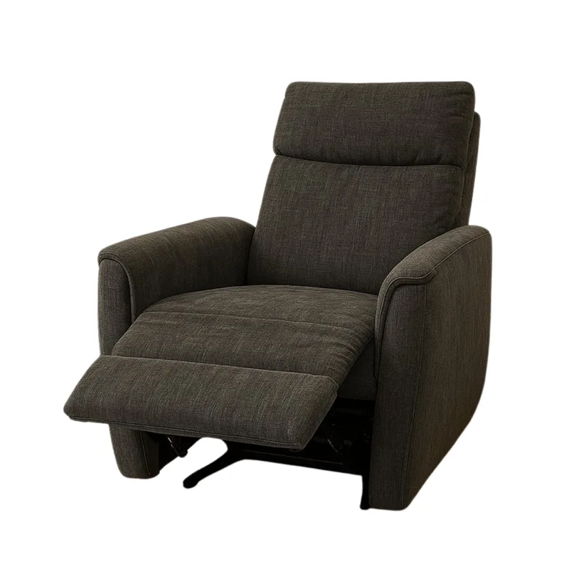 כורסה מעוצבת עם ריקליינר ידני ומשענת ראש מתכווננת.